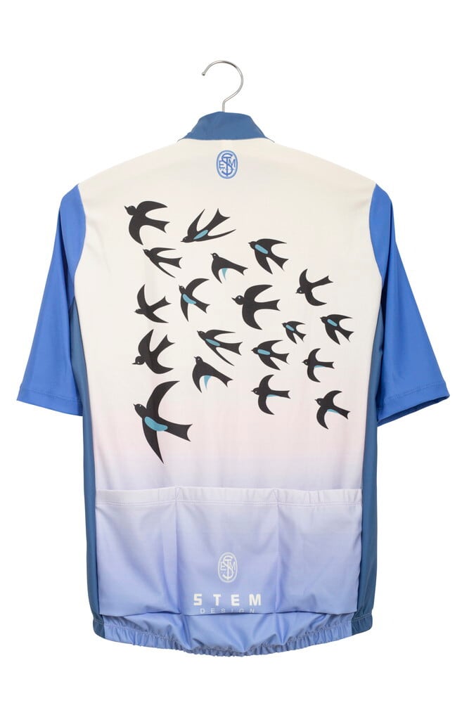 静かな水平線を飛翔する鳥のプリントは自然を満喫して駆け巡るサイクリストをイメージしてデザインに落とし込んでいます